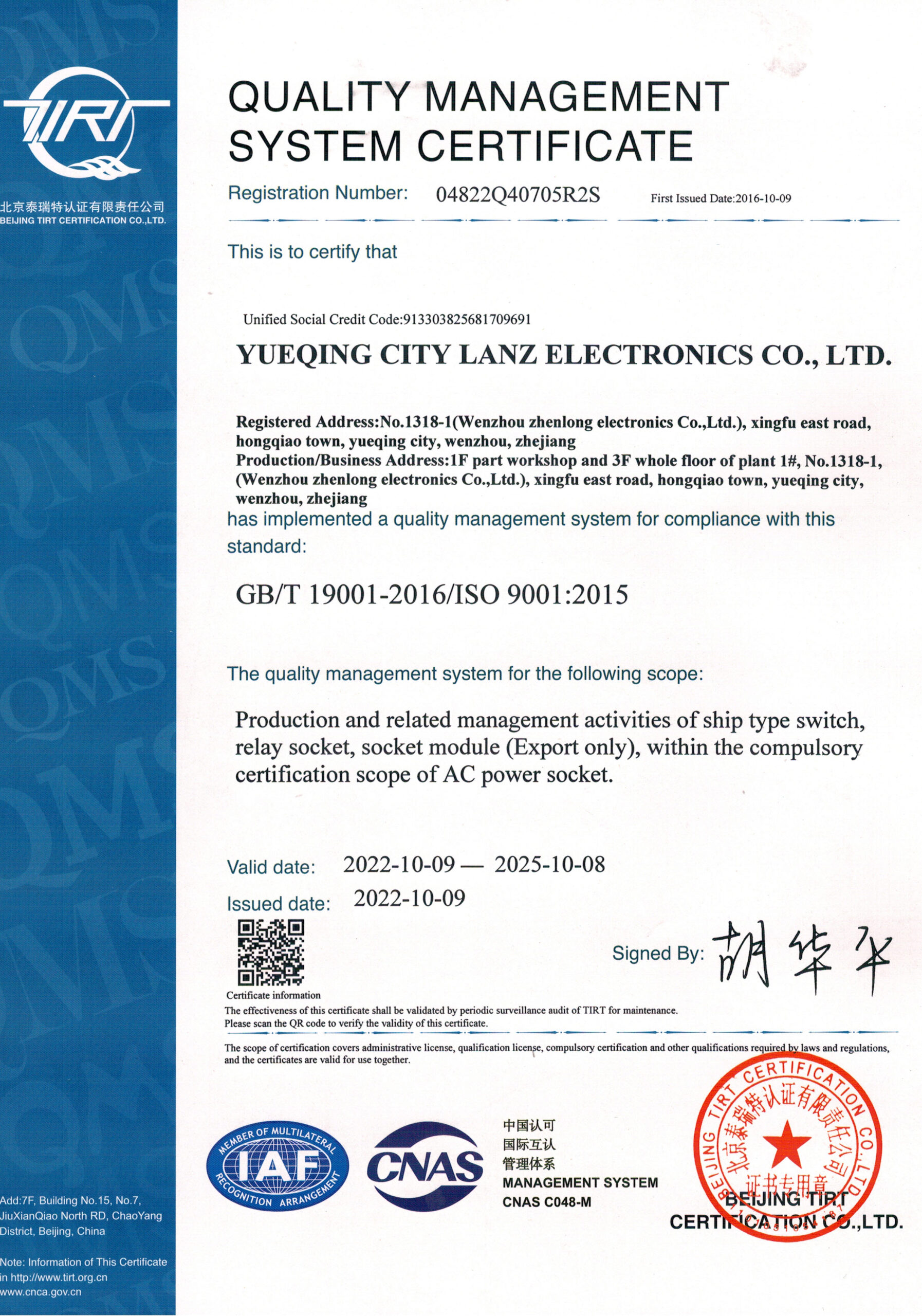 - Quality management system certificate